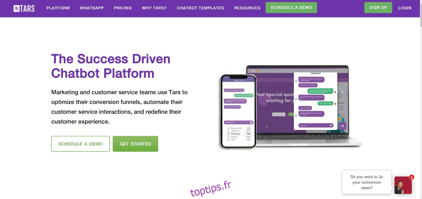 Tars est un chatbot IA pour la collecte de prospects, convivial et sans codage. Ses caractéristiques :