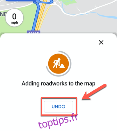 Si vous avez ajouté un signalement par erreur, vous avez quelques secondes pour l’annuler avant que celui-ci ne soit validé dans Google Maps. Appuyez sur « Annuler » si vous avez commis une erreur.