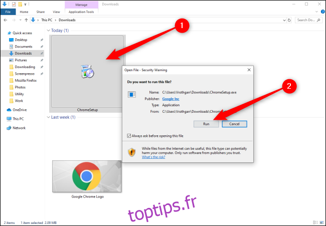 Par défaut, le fichier d’installation se trouvera dans votre répertoire « Téléchargements », à moins que vous n’ayez spécifié un autre emplacement dans les paramètres de votre navigateur actuel. Accédez à ce dossier via l’Explorateur de fichiers, double-cliquez sur le fichier « ChromeSetup » pour le lancer, puis cliquez sur « Exécuter ».