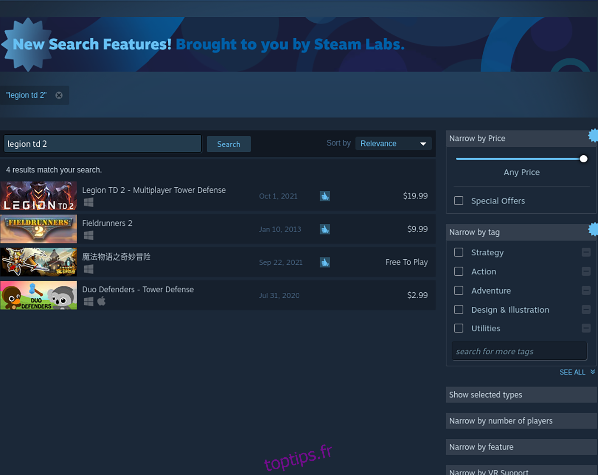Sélectionnez « Legion TD 2 » parmi les résultats de la recherche pour accéder à la page du jeu.