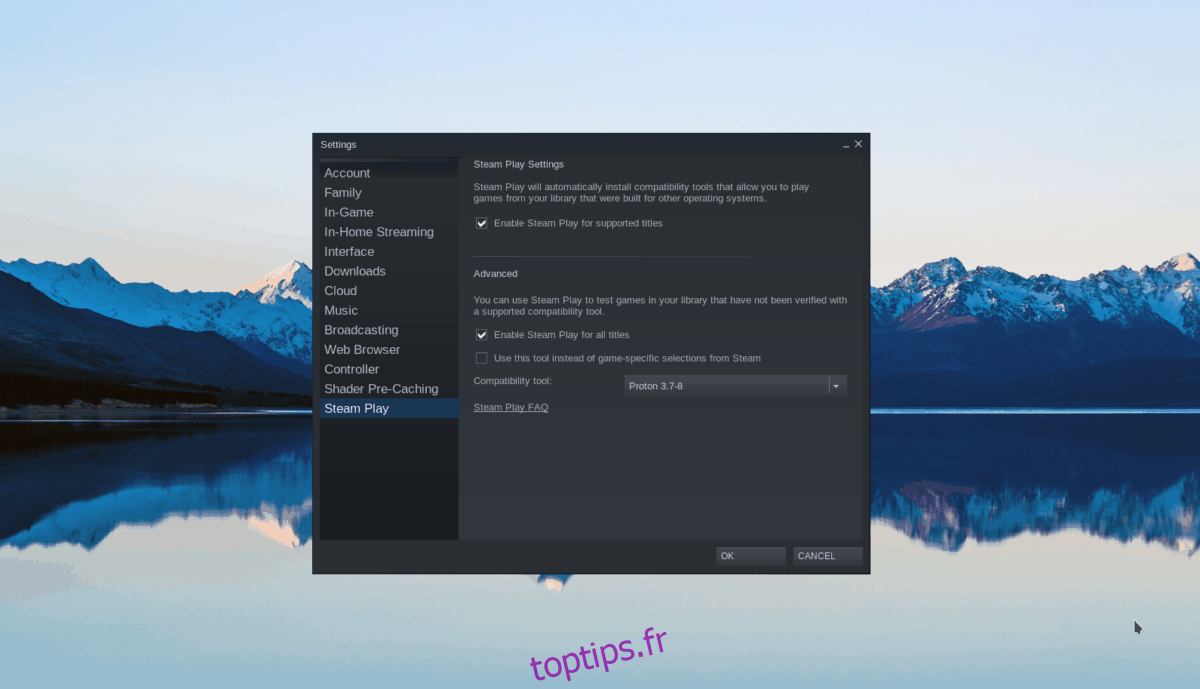 Dans les paramètres, cliquez sur « Steam Play ». Cochez les cases « Activer Steam Play pour les titres pris en charge » et « Activer Steam Play pour tous les autres titres ». Cliquez sur « OK » pour enregistrer les changements.