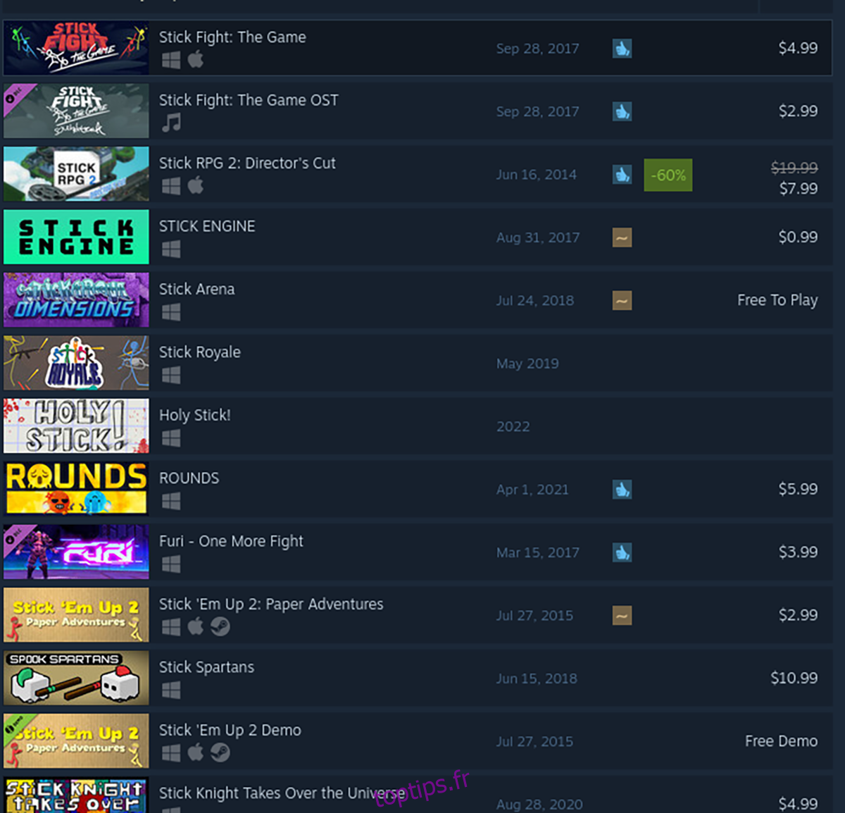 Étape 3: Parcourez les résultats et cliquez sur « Stick Fight: The Game » pour accéder à la page du jeu dans le magasin Steam.