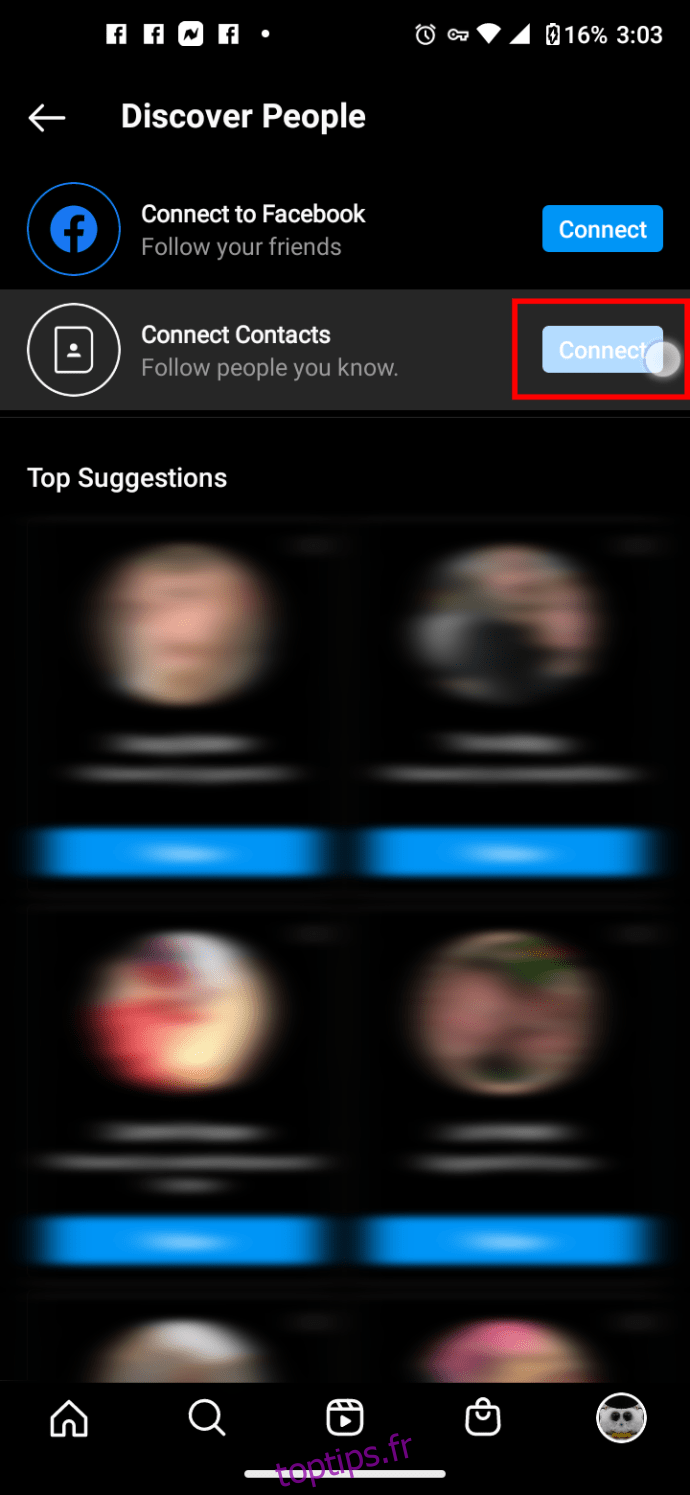 • Après la synchronisation d’Instagram avec vos contacts Google ou iOS, parcourez les « Meilleures suggestions », affichées en premier, ou explorez la section « La plupart des connexions mutuelles ».
