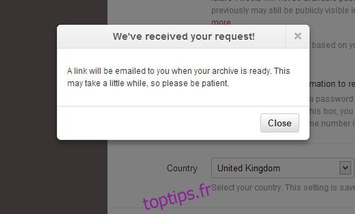 Accès aux anciens tweets étape 3 : Un message vous indiquera de patienter le temps de recevoir un e-mail. Dans notre cas, l’e-mail est arrivé en quelques minutes.