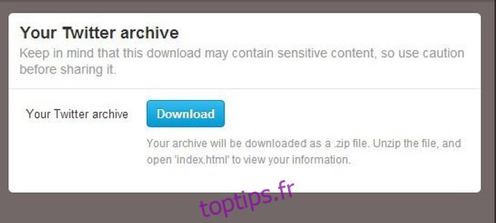 Accès aux anciens tweets étape 4 : L’e-mail contient un lien. Cliquez dessus et vous serez redirigé vers une page avec un bouton de téléchargement. Cliquez dessus pour télécharger vos anciens tweets sous la forme d’un fichier zip.