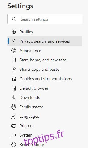 3. Dans le volet de gauche, sélectionnez « Confidentialité, recherche et services ».