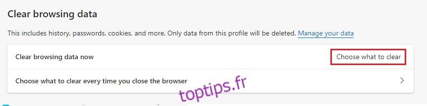 4. Dans la partie droite, cliquez sur « Choisir les éléments à effacer » sous « Effacer les données de navigation ».