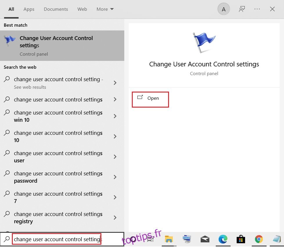 1. Appuyez sur la touche Windows, tapez « modifier le paramètre de contrôle de compte d’utilisateur » et cliquez sur « Ouvrir ».