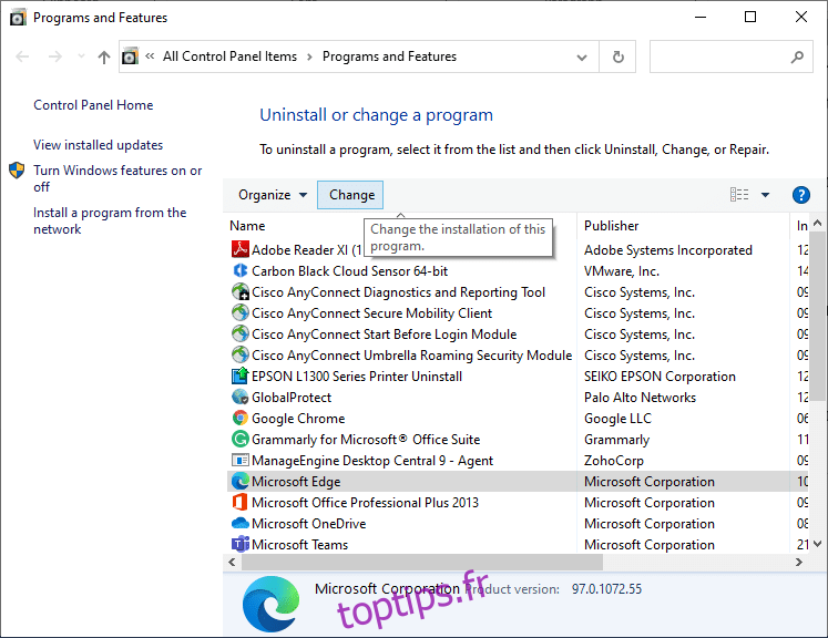 3. L’utilitaire « Programmes et fonctionnalités » s’ouvrira. Cliquez sur « Microsoft Edge » et sélectionnez « Modifier ».