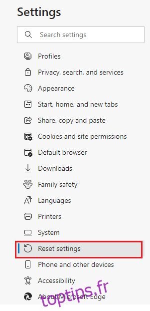 2. Dans le volet de gauche, cliquez sur « Réinitialiser les paramètres ».